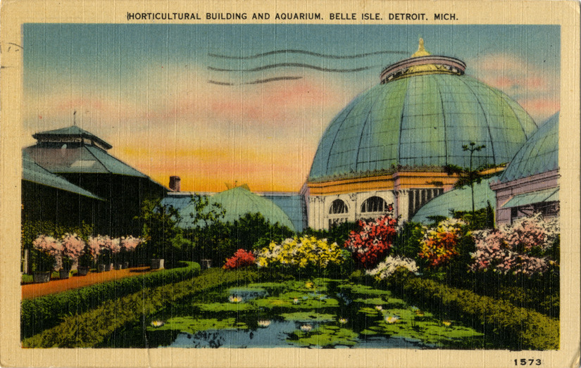 View of Horticultural Building and Aquarium on Belle Isle. Glass-paned building with dome is attached to aquarium building; pond with water lilies in foreground. Printed on front: "Horticultural Building and Aquarium, Belle Isle Park, Detroit, Mich., 1573." Metropolitan Metrocraft trademark printed on back. Handwritten on back: "Hello, [undecipherable] and Walter, July 3, 1944. Dear friends, just a word to let you know I am still breathing, well here I am back in Michigan again am working every day now got a good job. If I don't take the rambling blues but you know I get them sometimes and they are bad. Well wishing you all the best of luck will see you about cold weather [undecipherable]. Write me if there is any news. My address. 3634 3th St. Wyandotte, Mich. From Robt." Card is postmarked July 4, 1944.