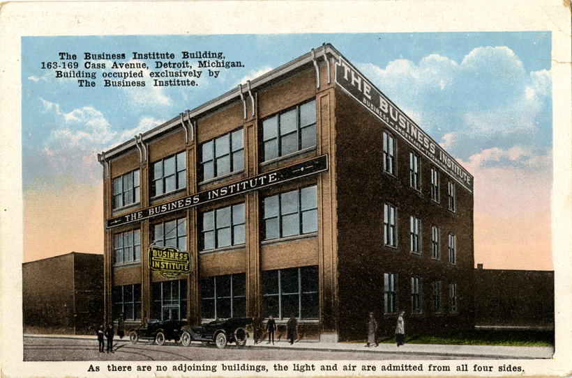 Front and side view of three-story brick Business Institute building. Automobiles parked in front. Printed on front: "The Business Institute Building, 163-169 Cass Avenue, Detroit, Michigan. Building occupied exclusively by the Business Institute. As there are no adjoining buildings, the light and air are admitted from all four sides."