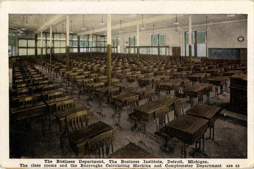 View rows of desks and chairs in classroom in the Business Department of the Business Institute. Printed on front: "The Business Department, the Business Institute, Detroit, Michigan. The class rooms and the Burroughs calculating machine and comptometer department are at." Printed on back: "In 1906 the present owners of the Business Institute planned a thoroughly modern business school, which they determined to make the best of its kind to be found anywhere. They did not plan a large school. They decided, though, that every effort should be made to provide the best in equipment, courses of study, in teaching staff, in thorough, up-to-date instruction, and in satisfactory employment service for graduates. As the result of carrying out this policy, The Business Institute has grown steadily in popularity and attendance until it is now unquestionably the largest, best equipped business school in Michigan and is one of the leading schools of its kind in America. Considerably over two thousand students attend the day and evening sessions of the Business Institute each year. The Business Institute is still owned by the men who organized it, and under their management the policy of thorough, high grade service to the student has been continuously in force. Remember, there is always a reason for the success of any institution, it is quality of service or quality of product."