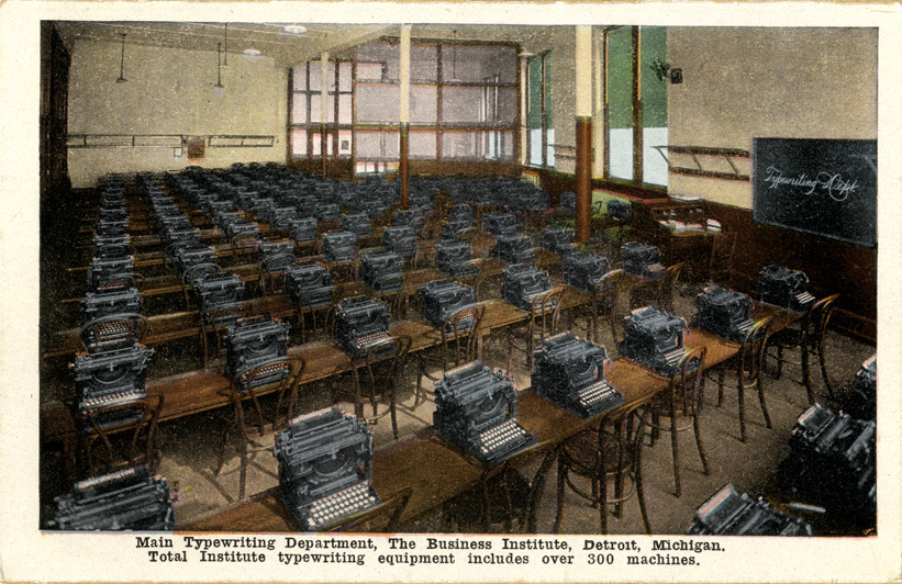 View rows of desks and typewriters in the classroom of the Typewriting Department at the Business Institute. Printed on front: "Main Typewriting Department, the Business Institute, Detroit, Michigan. Total Institute typewriting equipment includes over 300 machines." Printed on back: "To young ladies. There is nothing more interesting or more valuable for young women than the practical courses of study offered by the Business Institute. Those who acquire a thorough business training feel its safe-guarding influence and the spirit of independence which comes from the ability to earn one's livelihood. It is impossible to foresee conditions that may exist in the life any young woman. The only safe way is for her to be prepared to earn her living if it should become necessary. The Institute training for young ladies includes a brief six weeks' course, (calculating machine and comptometer,) a six month's course, (stenographic) and the complete secretarial training. A young lady will find in the associations at the Business Institute a carefully guarded atmosphere of refinement. She will have the friendship of capable, conscientious teachers, men and women of good influence and high ideals, and when she has completed her training she is sent out to office employment where the conditions and influences are favorable."