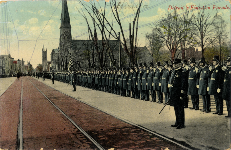 View of uniformed Detroit police officers assembled on the side of Woodward Avenue. Printed on front: "Detroit's finest on parade." Printed on back: "568 Wolverine News Co., Detroit, Mich. Printed in Belgium." Handwritten on back: "Sorry to dissapoint [sic] you but couldn't very well come. All are well. Mae is painting pantry. Father is digging sewer. Esther and Harold are at home. Emily is [undecipherable]. E.A.W." Card is postmarked July 9, 1908.