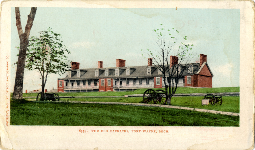 Favorite this☆ Barracks at Fort Wayne Description: View of soldiers' quarters at Fort Wayne; two-story brick building has roof dormers and covered verandas. Cannons in foreground. Printed on front: "The old barracks, Fort Wayne, Mich., 6354. Copyright 1902 by Detroit Photographic Co." Details Resource ID: bh010930 Subject: Fortification--Michigan--Detroit United States. Army--Barracks and quarters Ordnance--Michigan--Detroit Postcards Publisher: Detroit Photographic Co. Date Issued: 1902 Format: 1 postcard : col. ; 3.5 x 5.5 in. Member of: Burton Historical Collection Filing Location: D/Forts-Wayne Rights: Physical rights are retained by DPL. Copyright is retained in accordance with U.S. copyright laws.