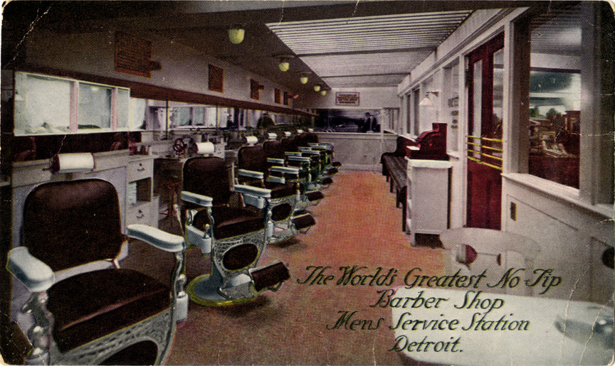 View of the interior of the Men's Service Station barbershop. Shop is furnished by barber chairs and cabinets. Printed on front: "The world's greatest no tip barber shop, Mens Service Station, Detroit." Printed on back: "The Men's Service Station. Opened July 21, 1917. Twelve departments of service for discriminating men. Michigan-Griswold-Lafayette."