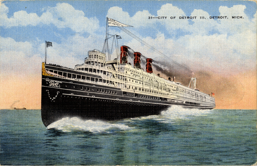 View of the ferryboat "City of Detroit III." Printed on front: "31, City of Detroit III, Detroit, Mich." Printed on back: "This steamer sails between Detroit and Buffalo during the spring and fall months, and between Detroit and Cleveland during the summer months. Passenger capacity, 1,440; gross tonnage, 6,061; length overall, 470 feet; speed, 19 miles per hour; automobile capacity, 93; dining room capacity, 270; staterooms, 435; crew, 230 officers and men. Pub. by United News Co., Detroit, Mich."