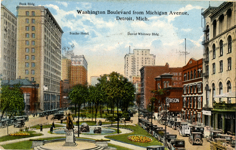View of Washington Boulevard, showing fountain and Alexander Macomb statue. Automobiles in street; Book Building, Statler Hotel and David Whitney Building in background. Printed on front: "Washington Boulevard from Michigan Avenue, Detroit, Mich. Book Bldg., Statler Hotel, David Whitney Bldg." Printed on back: "Washington Boulevard, from Michigan Avenue, Detroit, Mich. Washington Boulevard runs from Michigan Avenue to Grand Circus Park. The monument in foreground was donated by Daughters of American Revolution in honor of General Macomb. C.T. Photochrom." Handwritten on back: "924 Book Bldg. Dear Ruby, Am a Detroiter now and tired, almost dead. Do write. Lovingly, Emilie [undecipherable]." Card is postmarked September 1, 1922.