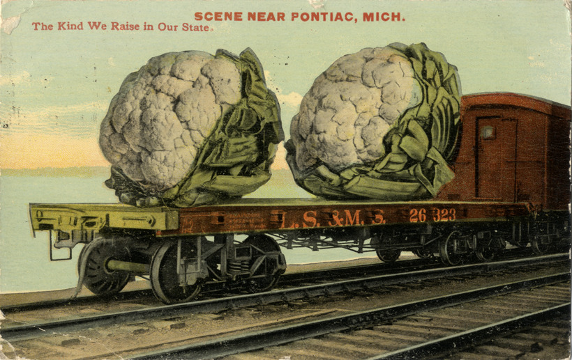 View of two giant heads of cauliflower on a railroad flatcar. Printed on front: "Scene near Pontiac, Mich. The kind we raise in our state." Handwritten on back: "Pontiac, Michigan, 9-22-1913. My dear aunt and sister, Here we are at home found everything all right. Jess was home getting supper was glad to see me little sweet heart has gone to sleep did you [undecipherable] anything down [undecipherable] tonight we did [undecipherable]." Card is postmarked September 29, 1913.