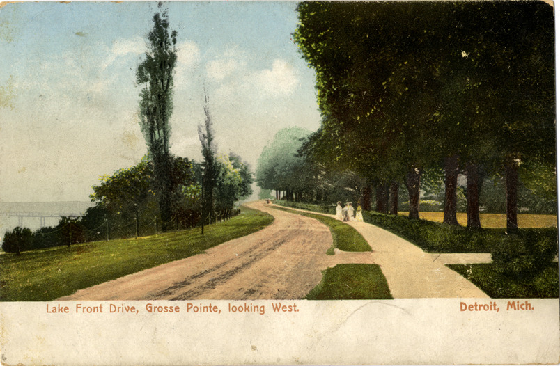 View of a tree-lined dirt road along lake in Grosse Pointe, Michigan. Printed on front: "Lake front drive, Grosse Pointe, looking west. Detroit, Mich." Printed on back: "A7369. Published by the Detroit News Company, Detroit, Mich., Leipzig, Dresden." Handwritten on back: "Feb. 8/08. Dear Sister, Rec'd your postal was glad to hear you where [sic] all well so thought I would scribble a few lines to let you know that we where [sic] all well to [sic]. My aint this awful cold weather were having hate to put my nose outdoors. I got a pretty postal from the same day I got the nice one you sent me. It's pretty. Write soon [undecipherable], love from all." Card is postmarked February 8, 1908.