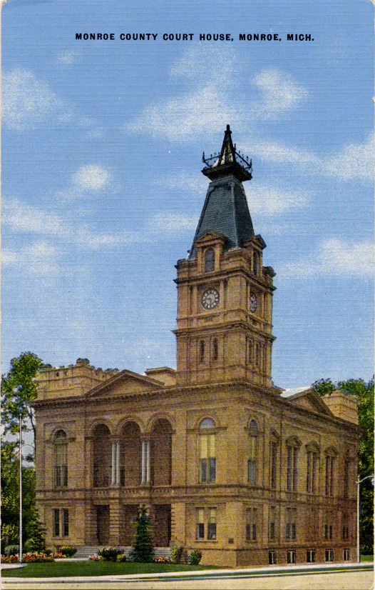 View of the Monroe County Court House in Monroe, Michigan. Printed on front: "Monroe County Court House, Monroe, Mich." Printed on back: "In 1780, Colonel Francis Navarre journeyed from the tiny French village known as Detroit to start a settlement on the banks of the River Aux Raisins. The village was peopled by Pottawattomie Indians. That settlement grew up to be modern Monroe. The American flag was raised over the little town in 1796. Published by Harkrader News Agency, Monroe, Mich. Natural color post card made in U.S.A. by E.C. Kropp Co., Milwaukee, Wis., DCL."