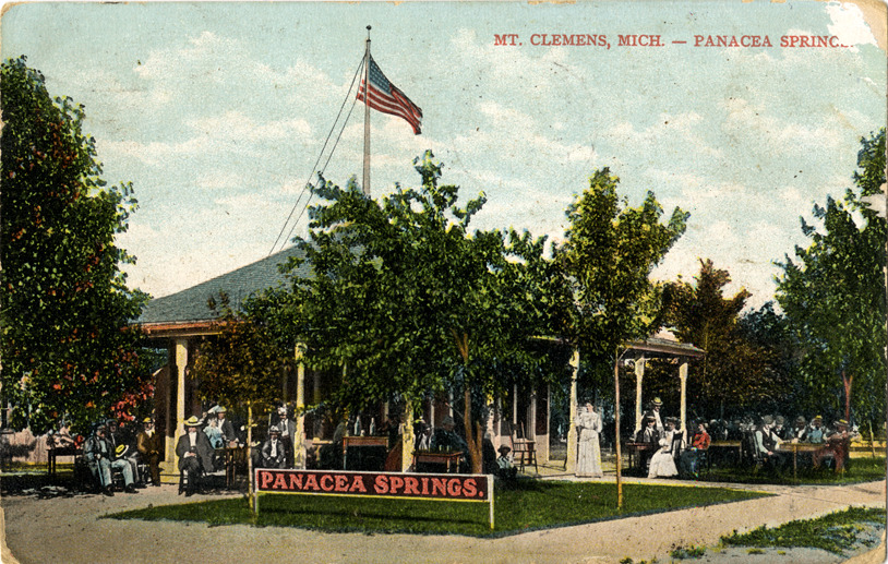 View of men and women dining and relaxing in front of the octagonal pavilion at Panacea Springs in Mount Clemens, Michigan. "Panacea Springs" sign in displayed in foreground. Printed on front: "Mt. Clemens, Mich., Panacea Springs." Printed on back: "Printed in Germany." Handwritten on back: "6-18-08. Thought I would drop you a card and let you know where I was. Have been ill. Am feeling better. Hope to go home next week. Kind regards to all. Let me hear from you soon. Margaret." Card is postmarked June 18, 1908.