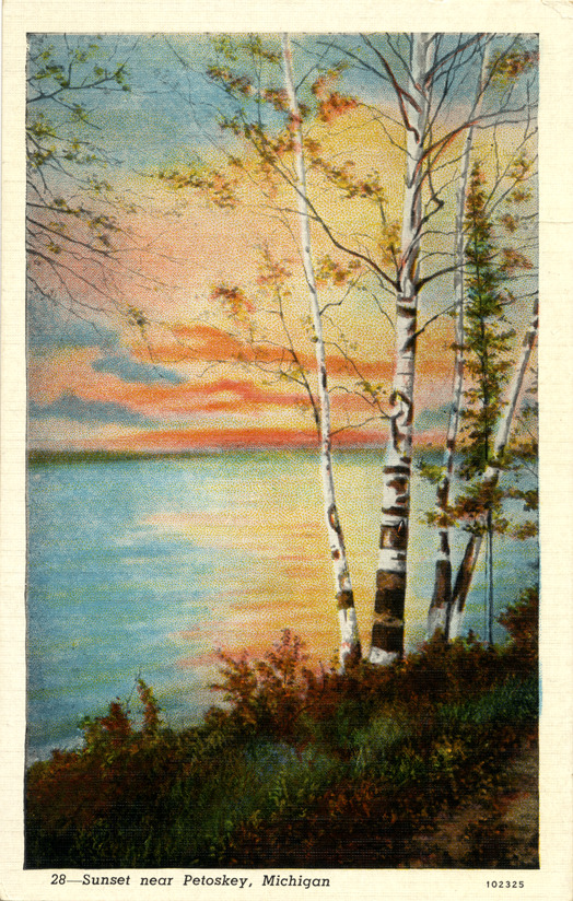 View of sunset over Lake Michigan near Petoskey, Michigan with birch trees in foreground. Printed on front: "28, Sunset near Petoskey, Michigan, 102325." Printed on back: "Mrs. A.G. Cook, Petoskey, Mich. Genuine Curteich-Chicago 'C.T. Art-Colortone' post card (reg. U.S. Pat. Off.)"
