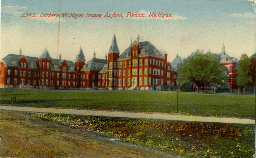 View of the Eastern Michigan Insane Asylum in Pontiac, Michigan. Printed on front: "2342, Eastern Michigan Insane Asylum, Pontiac, Michigan." Handwritten on back: "My dear Ma and Sister, Your welcome letter came & I am always glad to get them. We are well and will be in Detroit Sunday if all is well we went over to Franks last Sunday had a nice time. In love, Alma." Card is postmarked November 5, 1915.