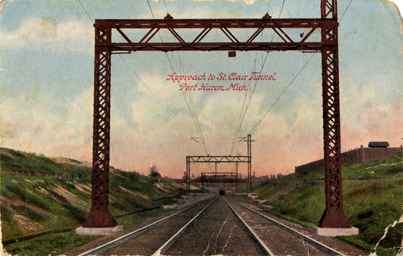 Favorite this☆ Approach to St. Clair Tunnel Description: View of the approach to the St. Clair Tunnel, with railroad tracks in foreground. Printed on front: "Approach to St. Clair , Port Huron, Michigan." Details Resource ID: bh011066 Subject: Saint Clair Tunnel (Mich. and Ont.) Railroad tunnels Postcards Date Issued: Unknown year Format: 1 postcard : col. ; 3.5 x 5.5 in. Member of: Burton Historical Collection Filing Location: M/Tunnels and tunneling Rights: Physical rights are retained by DPL. Copyright is retained in accordance with U.S. copyright laws.