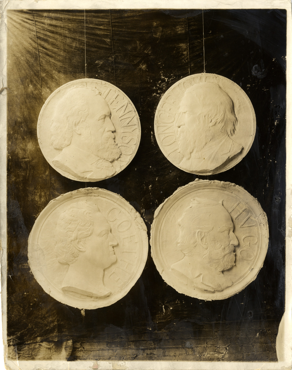 View of four terracotta portrait roundels for window lunettes on the Main Library, Detroit Public Library. Portraits depict Tennyson, Longfellow, Goethe and Hugo. Handwritten on back: "Terracotta."