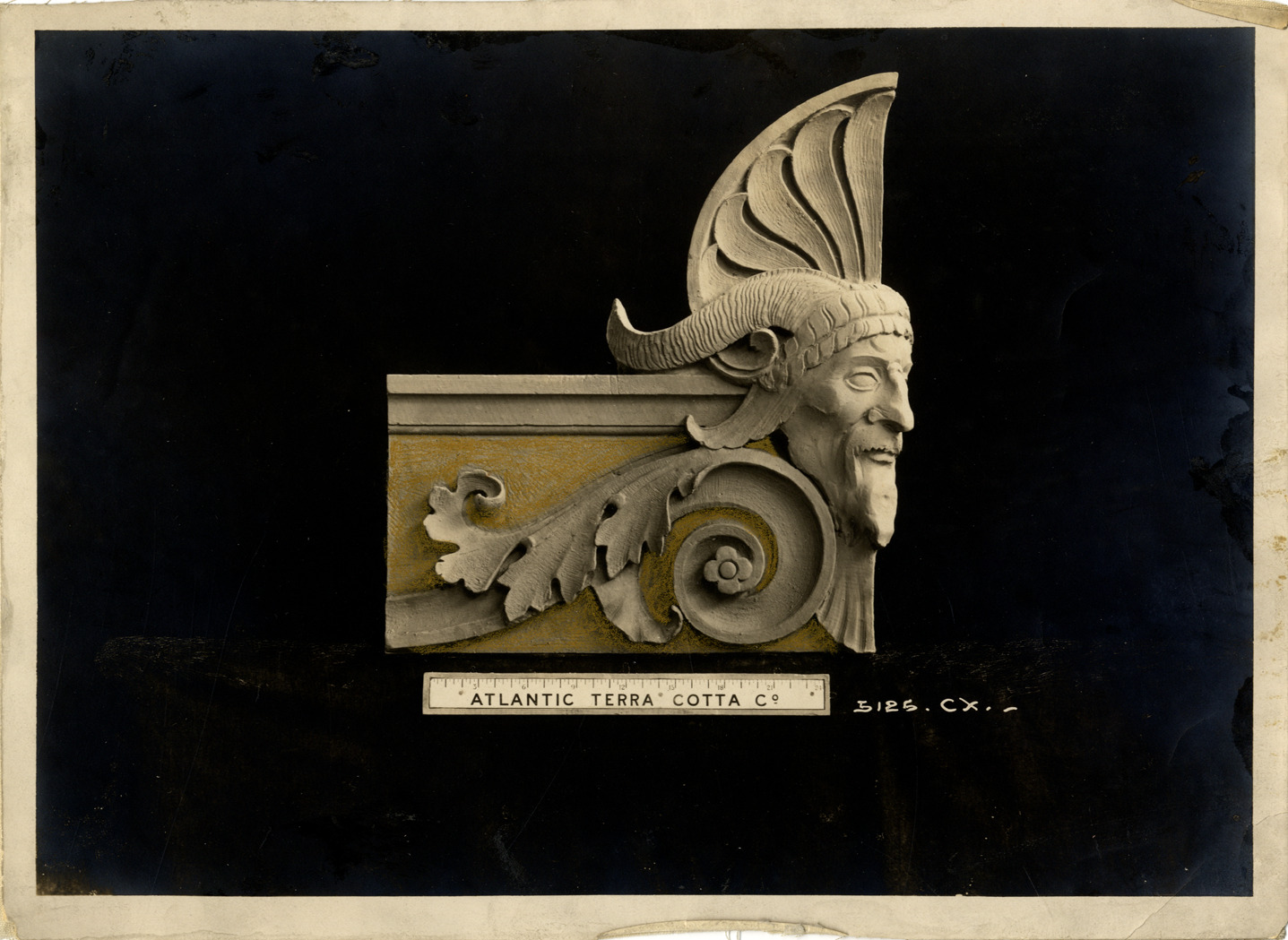Close-up view of a model for a cornice detail on the Main Library, Detroit Public Library. Ruler with "Atlantic Terra Cotta Co." is displayed below detail. Handwritten on back: "Terracotta."