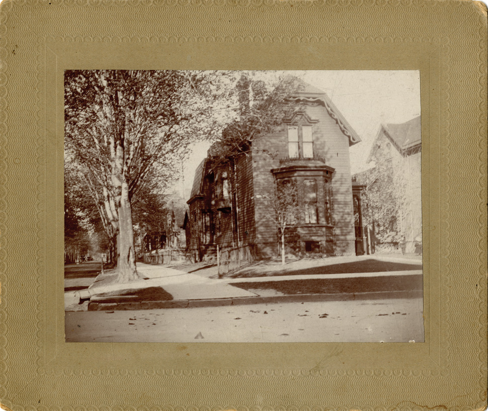 View of the residence of William Wallace Collier, a two-story, Queen Anne style wooden-frame house with bay window, located at the corner of Cass Avenue and Seldon. Handwritten on back: "House at the corner of Cass and Seldon Avenues, Detroit. First residence of William Wallace Collier. ca. 1895."