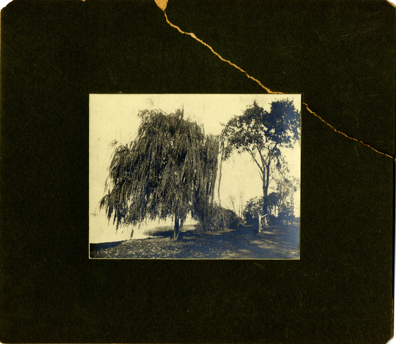 View of trees and a rustic wooden footbridge on Belle Isle. Handwritten on back: "Beside still waters."