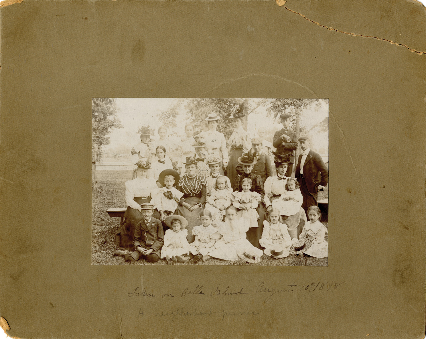 View of men, women and children posing for group portrait during a picnic on Belle Isle. Handwritten on front: "Taken on Belle Island, August 10th, 1898. A neighborhood picnic." Handwritten on back: "Taken August 10th 1898. On Belle Island. Fritze Ballie. Guss Ballie. Mrs. Ballie. Marie Ballie. Lipold. Oscar Lipold. Francis Ballie. Marie Geotz. May Ballie. Mrs. Gore. Mrs. Lipold. Julia Gore. Mrs. A. Geotz. Josie Ballie. Lipold. Bessie Ballie. Lipold. Miss Moran. Francis Geotz. Nora Brendle. Elinor Ballie. Theo Brendle. Sophia Ballie. Mrs. V. Field. Edward Field. Mrs. Brendel."