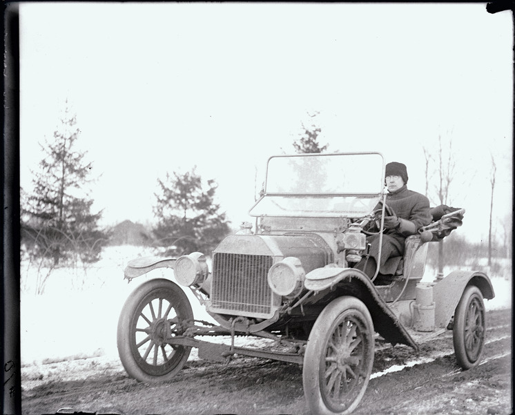 View of a man, identified as A.D., in an unidentified automobile on Belle Isle during winter. Handwritten on sleeve: "A.D. in car."