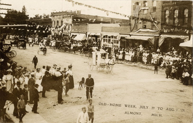 Favorite this☆ Parade during Old Home Week, Almont, Michigan Description: View of horse-drawn vehicles in parade for Old Home Week in Almont, Michigan. Spectators on sidewalks; commercial buildings in background. Printed on front: "Old Home Week, July 29 to Aug. 1 '09, Almont, Mich." Details Resource ID: bh011142 Subject: Parades--Michigan--Almont Horse-drawn vehicles--Michigan--Almont Commercial buildings--Michigan--Almont Streets--Michigan--Almont Photographic prints Postcards Date Issued: 1909 Format: 1 postcard ; 3.5 x 5.5 in. Member of: Burton Historical Collection Filing Location: M/Localities-Almont Rights: Physical rights are retained by DPL. Copyright is retained in accordance with U.S. copyright laws.
