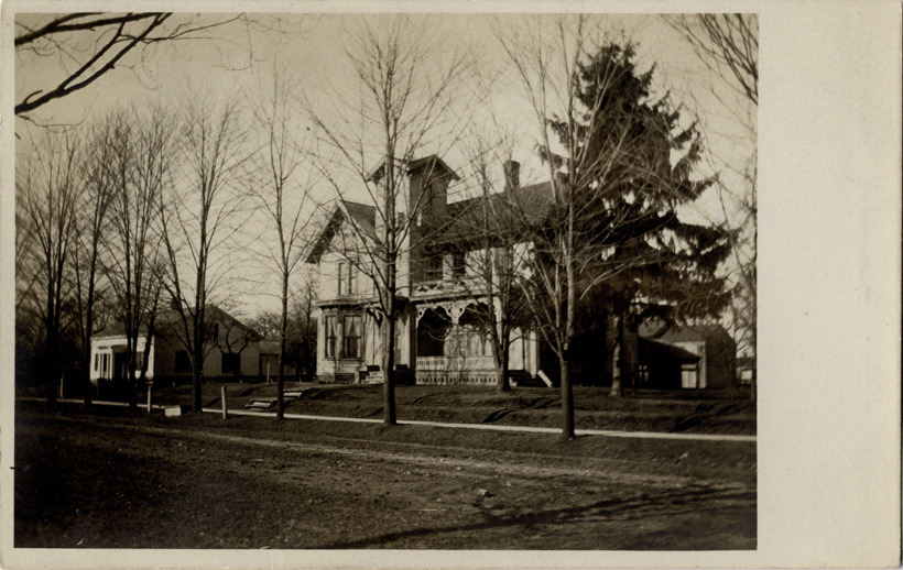 View of the Harris residence on West St. Clair Street in Almont, Michigan. Two-story, wooden-frame Gothic revival house has cupola and covered entry porch. Printed on back: "Allen Hancock, photographer, Almont, Mich." Handwritten on back: "The Harris house, West St. Clair St., Almont, Mich."