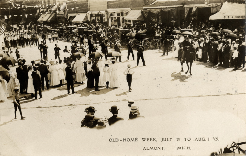 Favorite this☆ Parade during Old Home Week, Almont, Michigan Description: View of a marching band in parade for Old Home Week in Almont, Michigan. Spectators on sidewalks; commercial buildings in background. Printed on front: "Old Home Week, July 29 to Aug. 1 '09, Almont, Mich." Details Resource ID: bh011149 Subject: Marching bands--Michigan--Almont Parades--Michigan--Almont Commercial buildings--Michigan--Almont Streets--Michigan--Almont Photographic prints Postcards Date Issued: 1909 Format: 1 postcard ; 3.5 x 5.5 in. Member of: Burton Historical Collection Filing Location: M/Localities-Almont Rights: Physical rights are retained by DPL. Copyright is retained in accordance with U.S. copyright laws.
