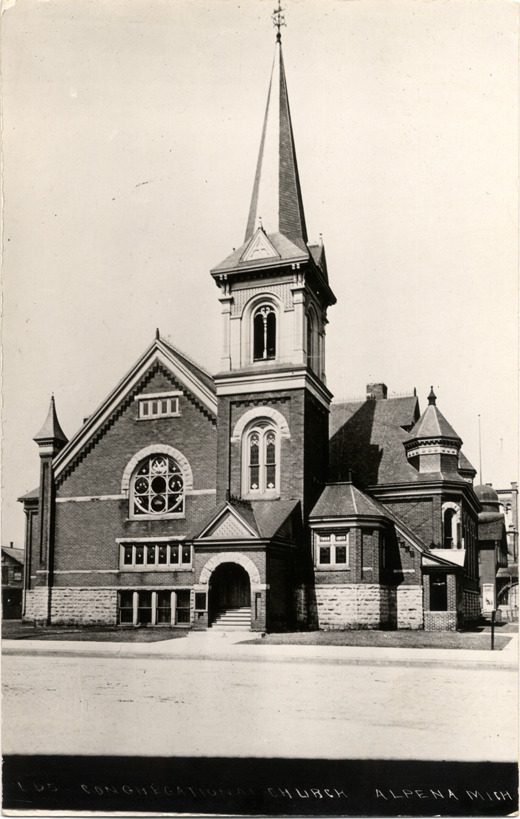 View of the First Congregational Church in Alpena, Michigan. Printed on front: "Congregational Church, Alpena, Mich."
