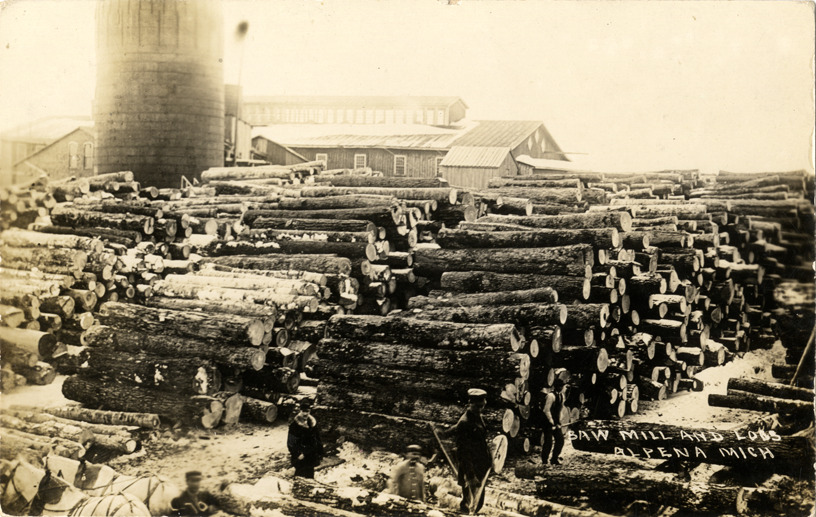 Favorite this☆ Logs stacked in front of sawmill, Alpena, Michigan Description: View of stacks of logs in front of sawmill in Alpena, Michigan. Several men with horse-drawn wagon in foreground. Printed on front: "Saw mill and logs, Alpena, Mich." Details Resource ID: bh011182 Subject: Sawmills--Michigan--Alpena Lumber trade--Michigan--Alpena Photographic prints Postcards Date Issued: Unknown year Format: 1 postcard ; 3.5 x 5.5 in. Member of: Burton Historical Collection Filing Location: M/Localities-Alpena Rights: Physical rights are retained by DPL. Copyright is retained in accordance with U.S. copyright laws.