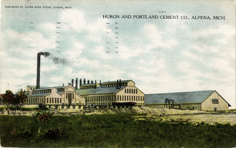View of the Huron-Portland Cement Company factory in Alpena, Michigan. Printed on front: "Huron and Portland Cement Co, Alpena, Mich. Published by Adams [sic] Book Store, Alpena, Mich." Handwritten on back: "Dear Geo, We had just a fine trip enjoying it immensely. We are here for the morning. This is a picture of where we landed. Will send you a card from the next stop. Mae." Card is postmarked July 30, 1909.