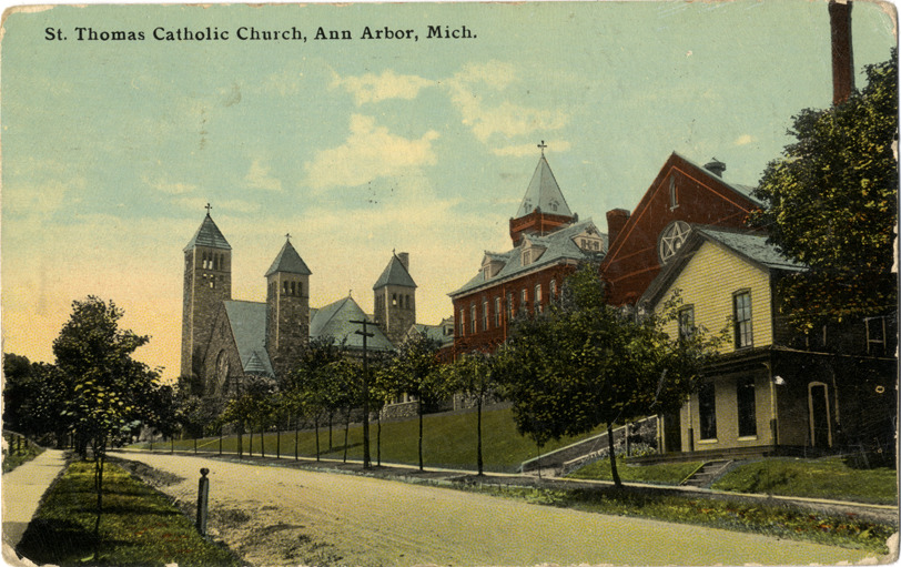 View of St. Thomas Catholic Church in Ann Arbor, Michigan. Printed on front: "St. Thomas Catholic Church, Ann Arbor, Mich." Printed on back: "Published by F.M. Kirby & Co., made in U.S.A." Handwritten on back: "Dear Lizzie, Received your letter and had not even time to write you a few words, because Al Noth came and bring me nice flowers from the Ladies Aid Society yesterday. Hope you feel good and [undecipherable] be you now. I am a little better today. Send the best regards to you all. From your loving Mother." Card is postmarked February 17, 1912.