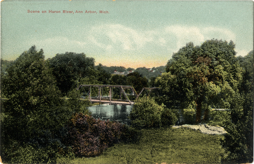 View of a truss bridge over the Huron River in Ann Arbor, Michigan. Printed on front: "Scene on Huron River, Ann Arbor, Mich." Printed on back: "No. C11071. Pub. by A.S. Lyndon, Ann Arbor, Mich. Litho-Chrome trade-mark, Leipzig, Berlin, Dresden. Printed in Germany."