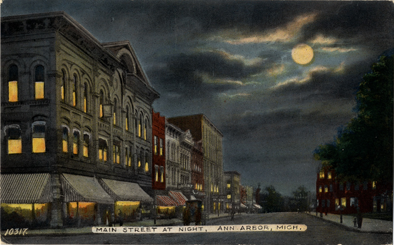 Favorite this☆ Main Street at night, Ann Arbor, Michigan Description: Nighttime view of Main St. in Ann Arbor, Michigan. Moon in background. Printed on front: "Main Street at night, Ann Arbor, Mich." Printed on back: "Pub. by the Acmegraph Co., Chicago." Details Resource ID: bh011239 Subject: Streets--Michigan--Ann Arbor Commercial buildings--Michigan--Ann Arbor Postcards Publisher: Acmegraph Co. Date Issued: Unknown year Format: 1 postcard : col. ; 3.5 x 5.5 in. Member of: Burton Historical Collection Filing Location: M/Localities-Ann Arbor Rights: Physical rights are retained by DPL. Copyright is retained in accordance with U.S. copyright laws.