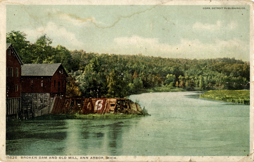 View of broken dam and old mill on river in Ann Arbor, Michigan. Printed on front: "11836, broken dam and old mill, Ann Arbor, Mich. Copr. Detroit Publishing Co." Printed on back: "Phostint card. Made only by Detroit Publishing Co., trademark reg. U.S. Pat. Off." Handwritten on back: "Ann Arbor, Mich. Dear Katherine: Arrived home all O.K. Am having those pictures printed but haven't been able to get them yet. How did you survive the storm. I hope it didn't damage your crops any. We are well. Will write again as soon as I get the picture. Good Bye, Charley." Card is postmarked August, 1920.