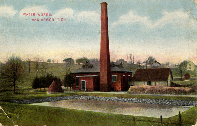 View of waterworks in Ann Arbor, Michigan, showing brick building with smokestack. Reservoir in foreground. Printed on front: "Water works, Ann Arbor, Mich." Handwritten on back: "Dear cousin, I am in the hospital and am getting along fine. I expect to see you before [undecipherable]. I will be glad to see you. Will close, Leona." Card is postmarked August 27, 1910.
