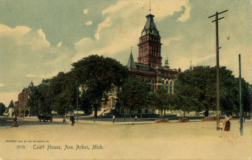 Favorite this☆ Courthouse, Ann Arbor, Michigan Description: View of the courthouse in Ann Arbor, Michigan. Printed on front: "Court house, Ann Arbor, Mich. 3779. Copyright 1904 by the Rotograph Co." Printed on back: "The Rotograph Co., N.Y. City (Germany)." Details Resource ID: bh011254 Subject: Courthouses--Michigan--Ann Arbor Postcards Publisher: Rotograph Co. Date Issued: 1904 Format: 1 postcard : col. ; 3.5 x 5.5 in. Member of: Burton Historical Collection Filing Location: M/Localities-Ann Arbor Rights: Physical rights are retained by DPL. Copyright is retained in accordance with U.S. copyright laws.