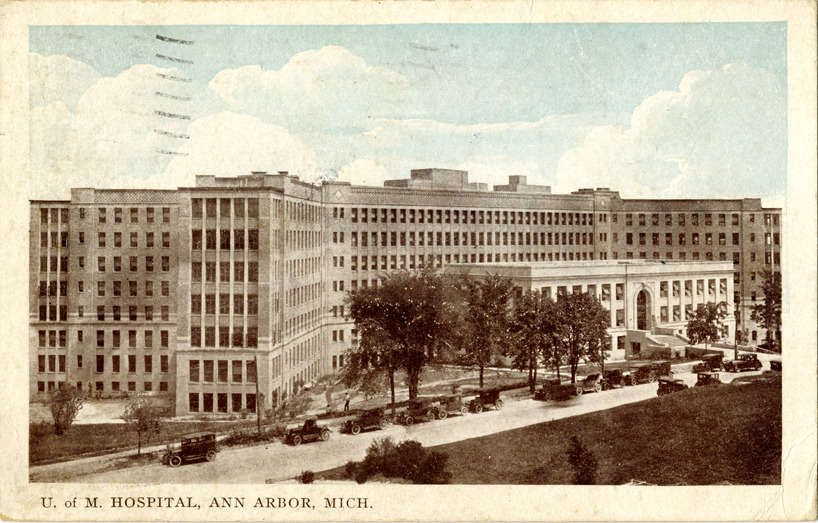 View of University of Michigan Hospital in Ann Arbor, Michigan. Printed on front: "U. of M. Hospital, Ann Arbor, Mich." Handwritten on back: "Dearest Mother, Have finished my examinations and am waiting for a bed in the main hospital. Everything is fine and I'll come thru O.K. Love, Bryce." Card is postmarked August 5, 1927.