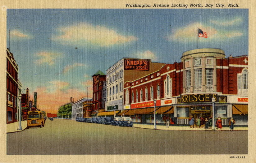 View of commercial buildings on Washington Ave. in Bay City, Michigan. Kresge's store on corner. Printed on front: "Washington Avenue looking north, Bay City, Mich." Printed on back: "Geo. L. Billings Co., Bay City, Mich. Genuine Curteich-Chicago 'C.T. Art-Colortone' post card (reg. U.S. Pat. Off.)"