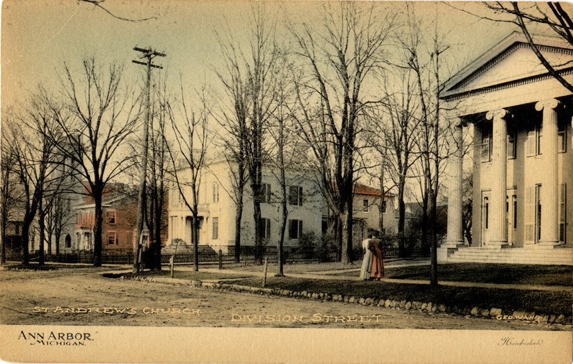 View of St. Andrew's Episcopal Church on Division Street in Ann Arbor, Michigan. Printed on front: "Ann Arbor, Michigan. St. Andrew's Church, Division Street. Geo. Wahr. Hand-colored." Printed on back: "The Albertype Co., Brooklyn, N.Y."