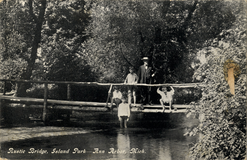 View of a man and several children on a rustic wooden bridge in Island Park at Ann Arbor, Michigan. Printed on front: "Rustic bridge, Island Park, Ann Arbor, Mich."