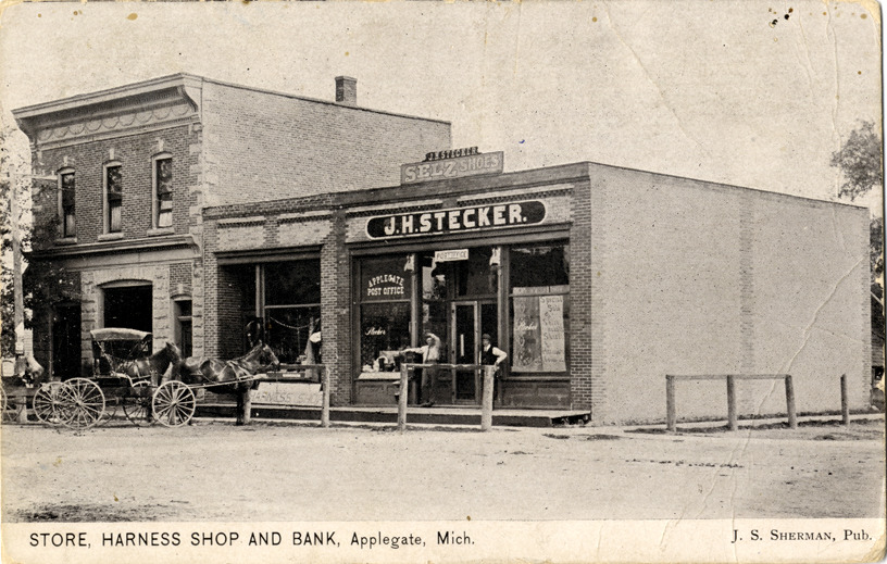 View of store, harness shop and bank in Applegate, Michigan. "J.H. Stecker" sign on building; horse-drawn carriage in street. Printed on front: "Store, harness shop and bank, Applegate, Mich. J.S. Sherman, pub." Printed on back: "Made by Diamond Post Card Co., Phila., Pa." Handwritten on back: "Hello Robert, Erma and I are to meet us and will tell you the news by the next postcard we had oatmeal & cream this morning, gee it was good. With love, Ma & Erma." Card is postmarked September 2, 1911.