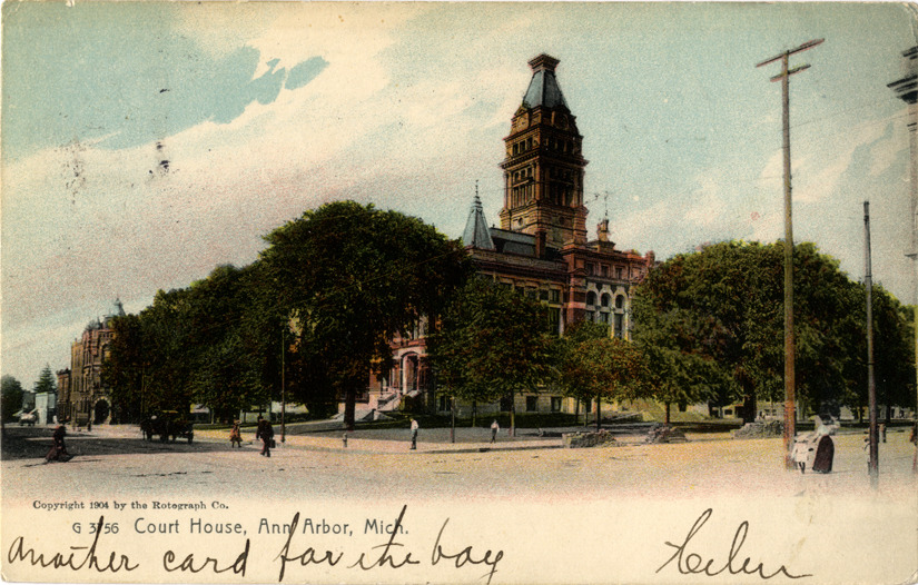 View of the courthouse in Ann Arbor, Michigan. Printed on front: "Court house, Ann Arbor, Mich. G3756. Copyright 1904 by the Rotograph Co." Handwritten on front: "Another card for the boy. Helen." Printed on back: "The Rotograph Co., N.Y. City (Germany)." Card is postmarked August 6, 1907.