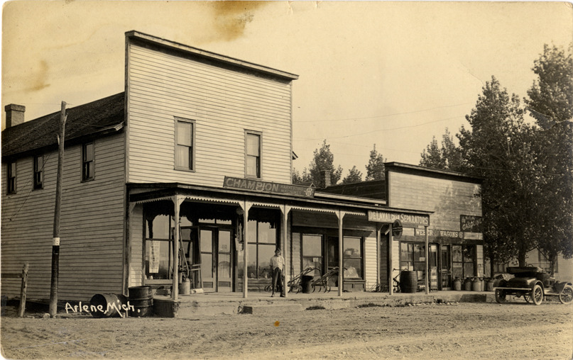 View of wooden-frame stores in Arlene, Michigan. Signs on building for Champion harvesting machines, DeLaval cream separators, Weber wagons and gasoline. Automobile in foreground. Printed on front: "Arlene, Mich." Handwritten on back: "Arlene, Mch. Have been having quinsy. Have had an awful time. Good by, write soon." Card is postmarked August 12, 1924.