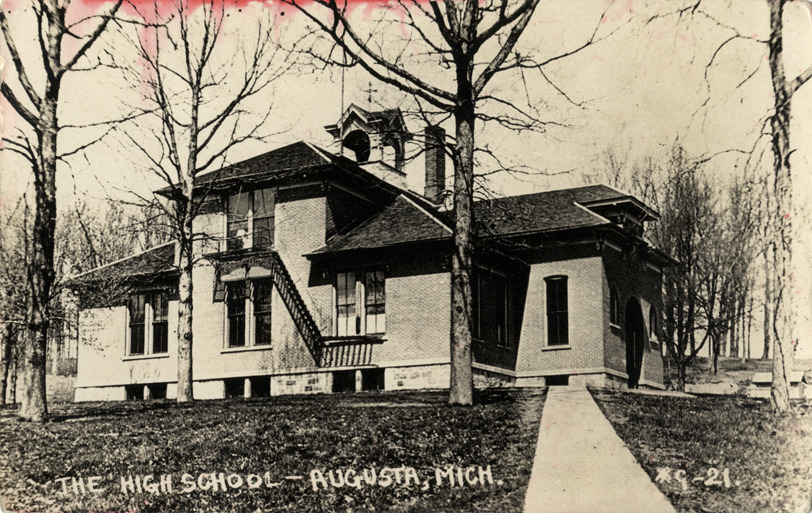 View of the high school in Augusta, Michigan. Printed on front: "The high school, Augusta, Mich. 9-21." Printed on back: "C.R. Childs photograph post cards, Chicago." Handwritten on back: "Dear Dela, I have been looking for a letter, but have not received it. Suppose you are terribly busy. I don't have much time hanging idly on my hands! Dela, will you please inquire, if you do not already know, if they need a math & Eng. teacher there next yr. & let me know as soon as possible? & sup't. I shall be ever so much obliged. Mamma is laid up for 6 wks. as result of fall. Love, Hazel."