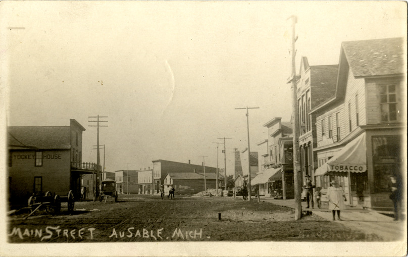 View of commercial buildings on Main Street in Au Sable, Michigan. Printed on front: "Main Street, Au Sable, Mich." Handwritten on back: "Dear Mac, How do you like this? Who's your [undecipherable] friend on the front? I can't remember her name. I'll be in Detroit next Wednesday, all day. I'll look you up. I'm an old married lady now. When do you have your vacation? [undecipherable]." Card is postmarked July 25, 1914.
