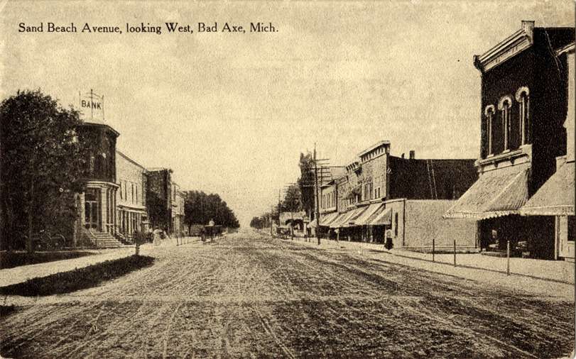Favorite this☆ Sand Beach Avenue, Bad Axe, Michigan Description: View of commercial buildings on Sand Beach Ave. in Bad Axe, Michigan. Printed on front: "Sand Beach Avenue, looking west, Bad Axe, Mich." Printed on back: "N.E. Paper & Stationery Co. mfrs., Ayer, Mass." Details Resource ID: bh011354 Subject: Streets--Michigan--Bad Axe Commercial buildings--Michigan--Bad Axe Postcards Publisher: N.E. Paper & Stationery Co. Date Issued: Unknown year Format: 1 postcard ; 3.5 x 5.5 in. Member of: Burton Historical Collection Filing Location: M/Localities-Bad Axe Rights: Physical rights are retained by DPL. Copyright is retained in accordance with U.S. copyright laws.