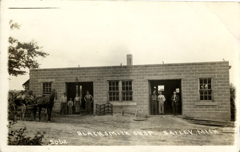 View of men posing in front blacksmith shop in Bailey, Michigan. Horse-drawn carriage on left. Printed on front: "Blacksmith shop, Bailey, Mich." Handwritten on back: "Bailey, Mich., May 26, '15. Dear ones at home, Well Ma I hope this card will find you gaining. We are all OK down here. I will be down Sat. night. Seth." Card is postmarked May 27, 1915.
