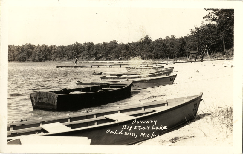 View of boats on the shore of Big Stay Lake in Baldwin, Michigan. Printed on front: "Bowery, Big Stay Lake, Baldwin, Michigan." Handwritten on back: "It is grand here. We are right back of these boats. The woods is so dense we can't see our cabin from the beach. No. 10 is our boat. It is 65 now at noon. Had to wrap up in wool blanket last nite. The [undecipherable]." Card is postmarked August 12, 1941.