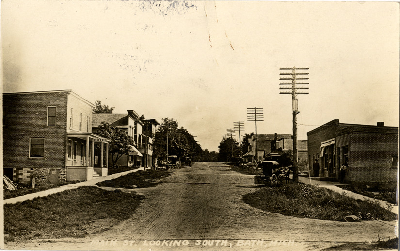 View of commercial buildings on Main St. in Bath, Michigan. Printed on front: "Main St. looking south, Bath, Mich."