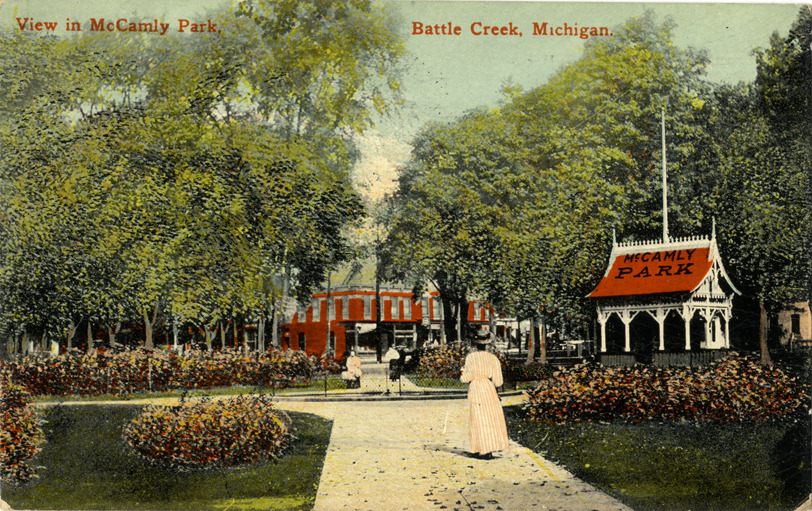View of the McCamly Park in Battle Creek, Michigan. Woman on sidewalk in foreground; gazebo in background. Printed on front: "View in McCamly Park, Battle Creek, Michigan." Handwritten on back: "Pontiac. Dear Elizabeth, Got home Friday eve. Got lots to do to make up for any absence. Will write you soon and tell you what a nice time I had. Am going to the County Federation at Birmingham Thursday. Am I not a 'gadder.' Lovingly, Belle." Card is postmarked October 25, 1910.