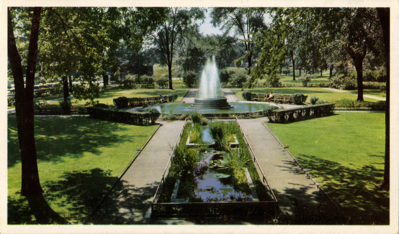 View of Kellogg Park and fountain in Battle Creek, Michigan. Printed on back: "Kellogg Park and fountain. Kellogg's home plant and office at Battle Creek overlook this beautiful park. The continually changing sprays of the fountain become even more beautiful at night under ever-varied light combinations. Kellogg's corn flakes, the original. Kellogg's the greatest name in cereals."
