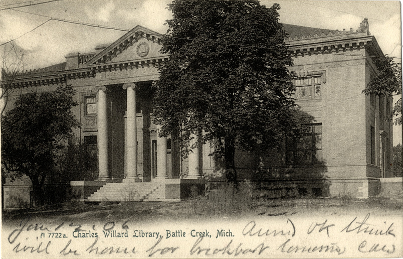 View of the Willard Library in Battle Creek, Michigan. Printed on front: "A7722a. Charles Willard Library, Battle Creek, Mich." Handwritten on front: "Jan. 12 '06. [undecipherable] OK think I will be home for breakfast tomorrow. CAW." Printed on back: "the Rotograph Co., N.Y., City (Germany)." Card is postmarked January 12, 1906.